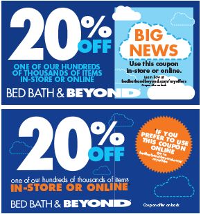 Bed Bath and Beyond Coupon: Extra $20 Off $80+ Order | First … In addition, Bed Bath & Beyond will continue to send you various coupons, such extra $20 off $80, extra $5 off $15 or an extra 20% off your entire purchase. Keep and eye out for these coupons, they will be sent often! Plus, once you place an online order, Bed Bath & Beyond will continue to send coupons straight to your home.