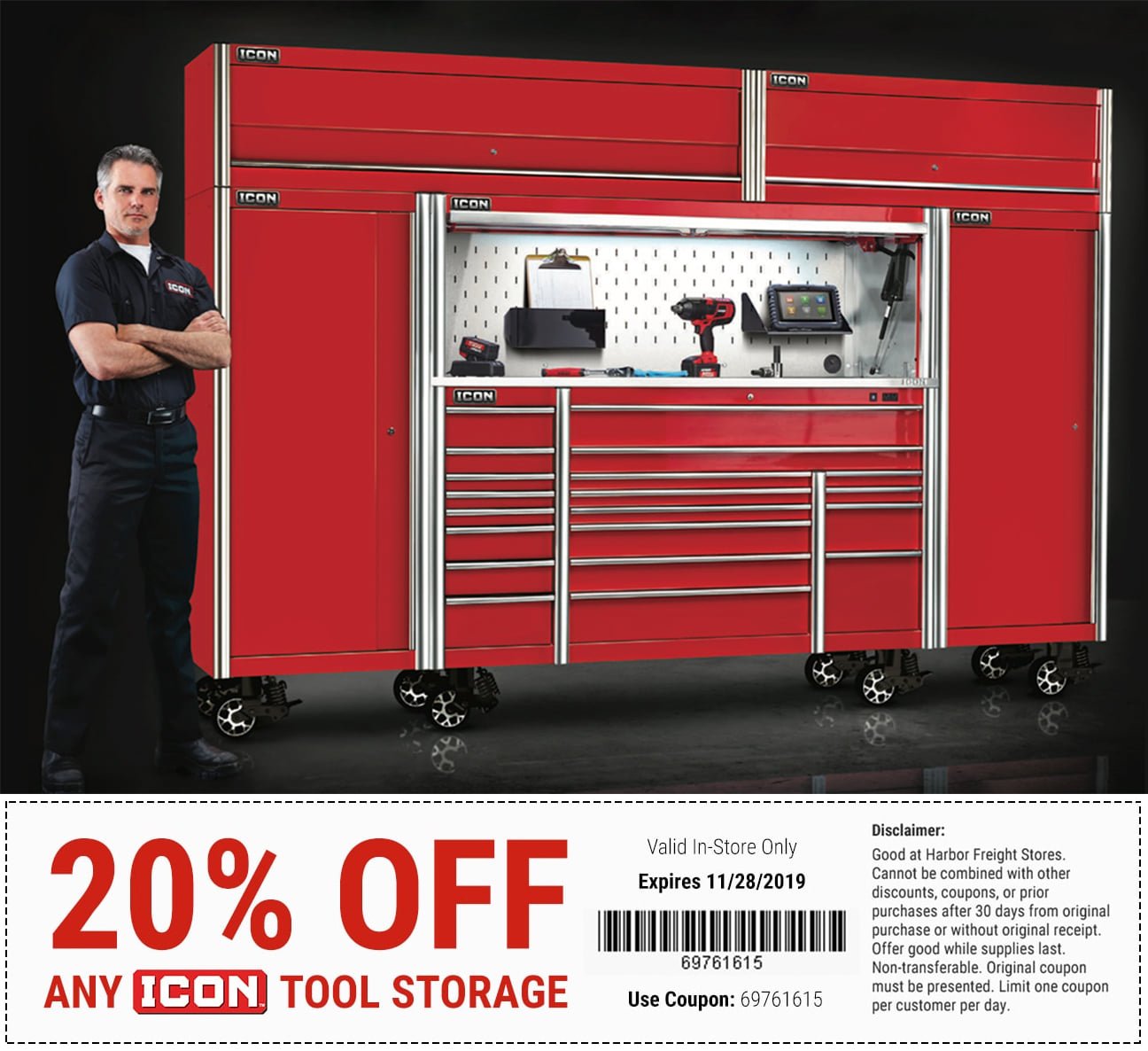 20% Off Icons.com Coupon Codes 15% Off! Add items to your cart and use ... 8 Valid Icons Discount Codes. Guaranteed to Save You up to 10%. 15% Off! Add items to your cart and use this code at checkout to get this offer. EOF Icon Tool Storage - Harbor Freight Amount of $299 or more with equal monthly payments † Cannot be combined with other credit offers LEARN MORE 56" Roll Cab $2499 $70 /mo 36 Equal Monthly Payments† 0% Interest Shop Now 73" Roll Cab $3499 $98 /mo 36 Equal Monthly Payments† 0% Interest Shop Now ICON Hand Tools to fill your Storage Cabinets Shop ICON Hand Tools 20% Off Any ICON Hand Tool or Storage - Harbor Freight Coupons 20% Off Any ICON Hand Tool or Storage Tool truck quality. Unbeatable prices. Experience our new line of ICON hand tools and ICON tool storage at a Harbor Freight location near you. Save 20% off any ICON hand tool or tool storage with coupon code 41066589, now through 7/31/20.