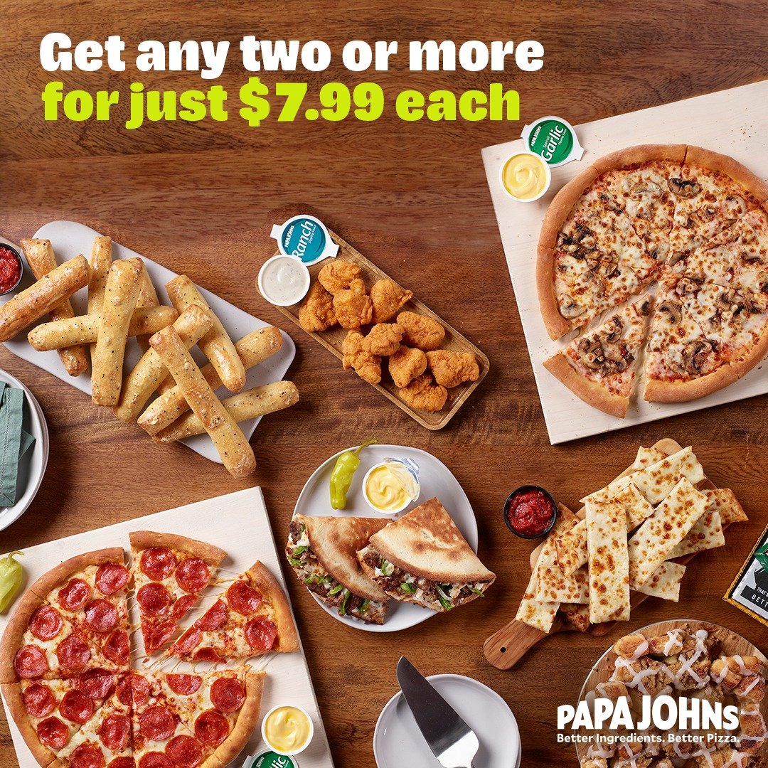 Papa John's Pizza Coupons, Promo Codes & Offers (Sep 2022) GET COUPON Grab Two Large Pizzas For just $12 Each Pick your favorite 2-toppings on TWO of our large crust pizzas. Available at Papa John's! Verified GET DEAL $ 23.99 Only DEAL Family Special: 1 Large Specialty Pizza + 1 Large 2-Topping Pizza for $23.99 Enjoy 1 Large Specialty Pizza and 1 Large 2-Topping Pizza for $23.99. No coupon needed. Verified